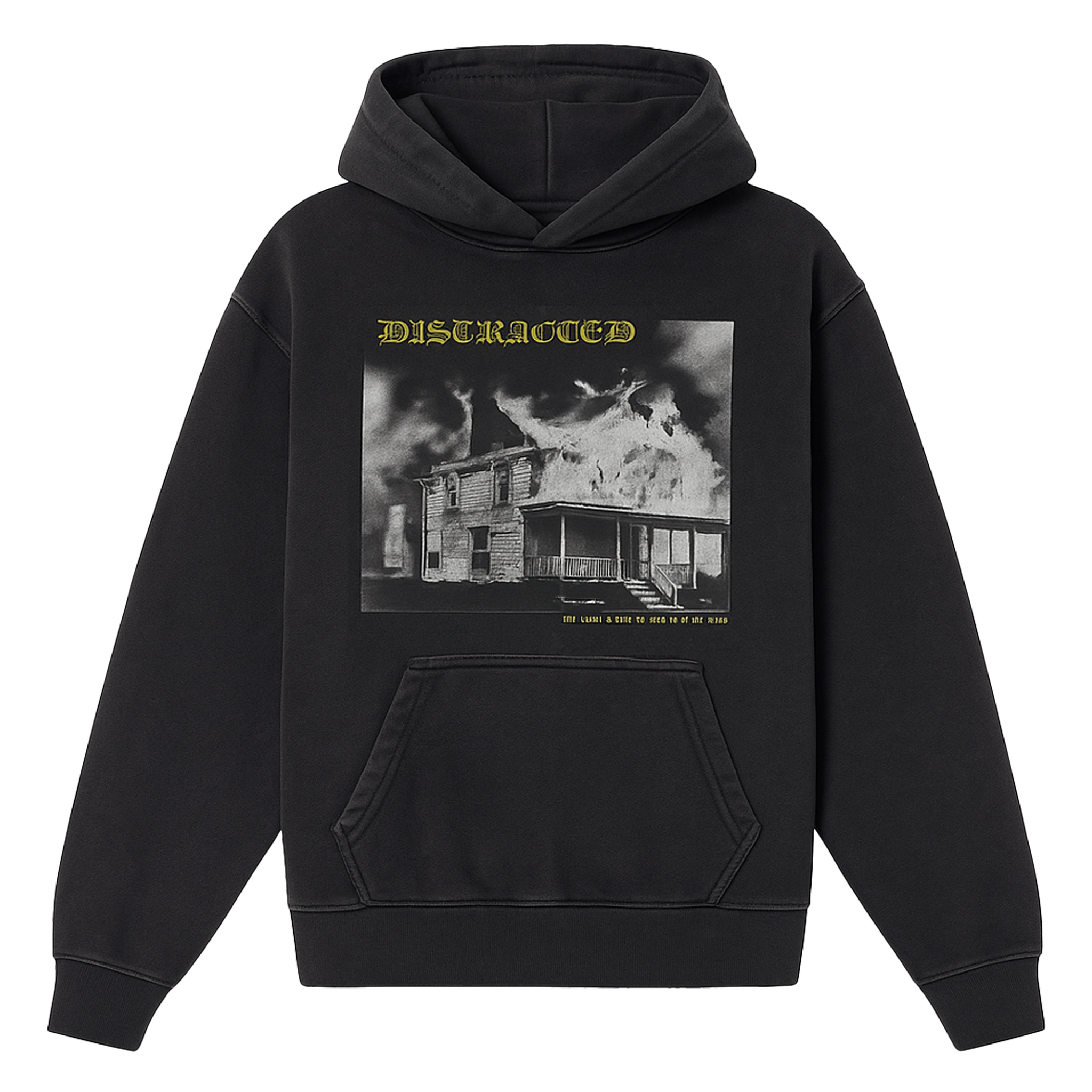 The Burnout Hoodie showcases a two-color screen-printed graphic across the chest, in white and yellow ink on a vintage faded black, heavyweight cotton hoodie. The fabric used is dyed and pre-shrunk, so that a wash will not affect the size or feel of the garment. Fits true to size with a slightly boxy silhouette.