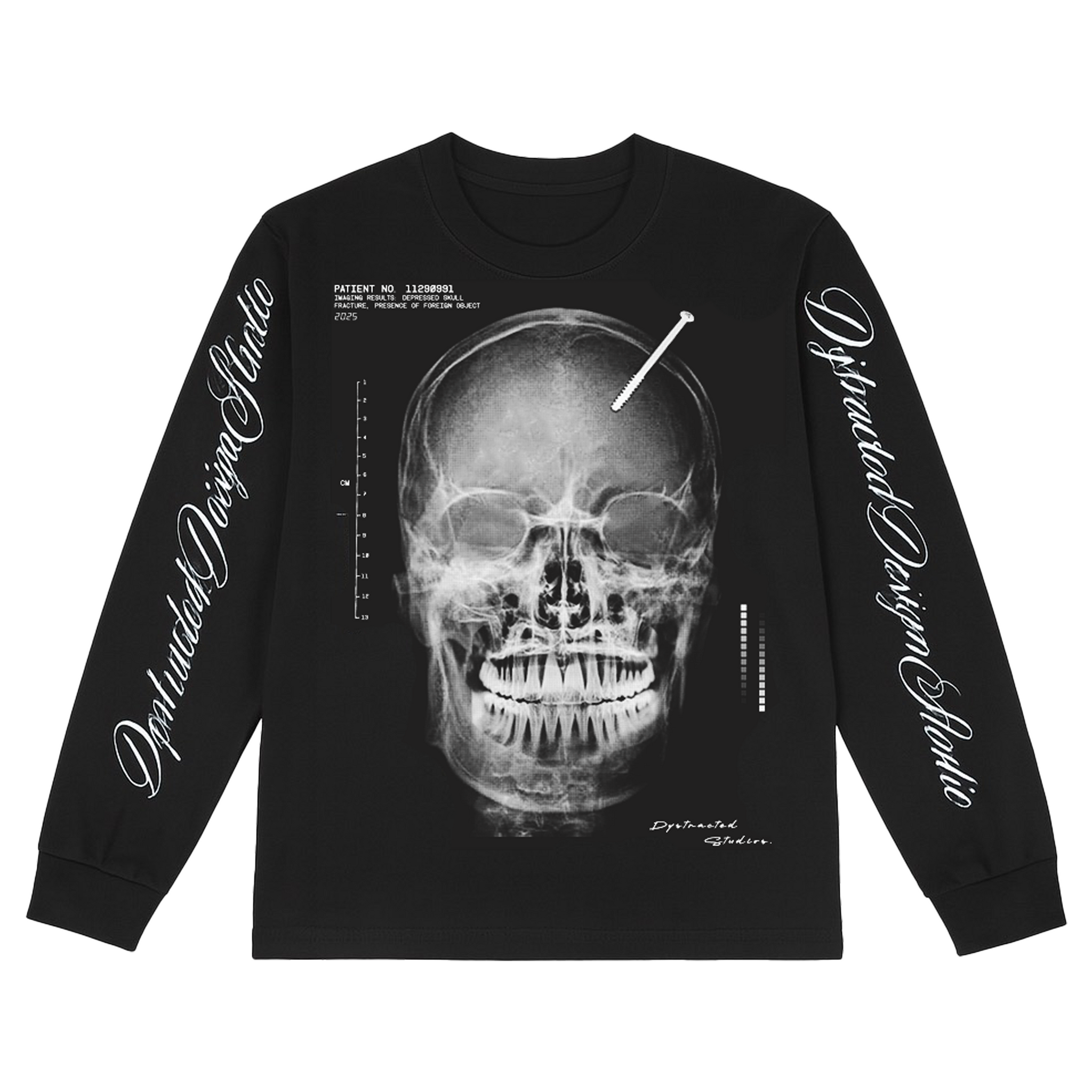 The Screwhead Long Sleeve Tee showcases a screen-printed graphic across the chest, and our script logo printed on both sleeves. It features white ink on a black, heavyweight cotton shirt. The fabric used is dyed and pre-shrunk, so that a wash will not affect the size or feel of the garment. Fits true to size with a slightly boxy silhouette.