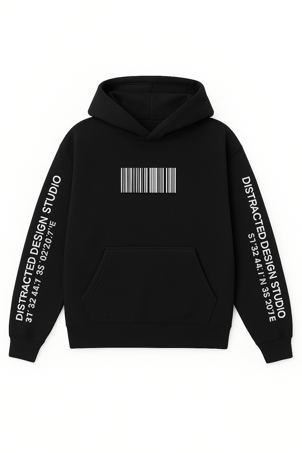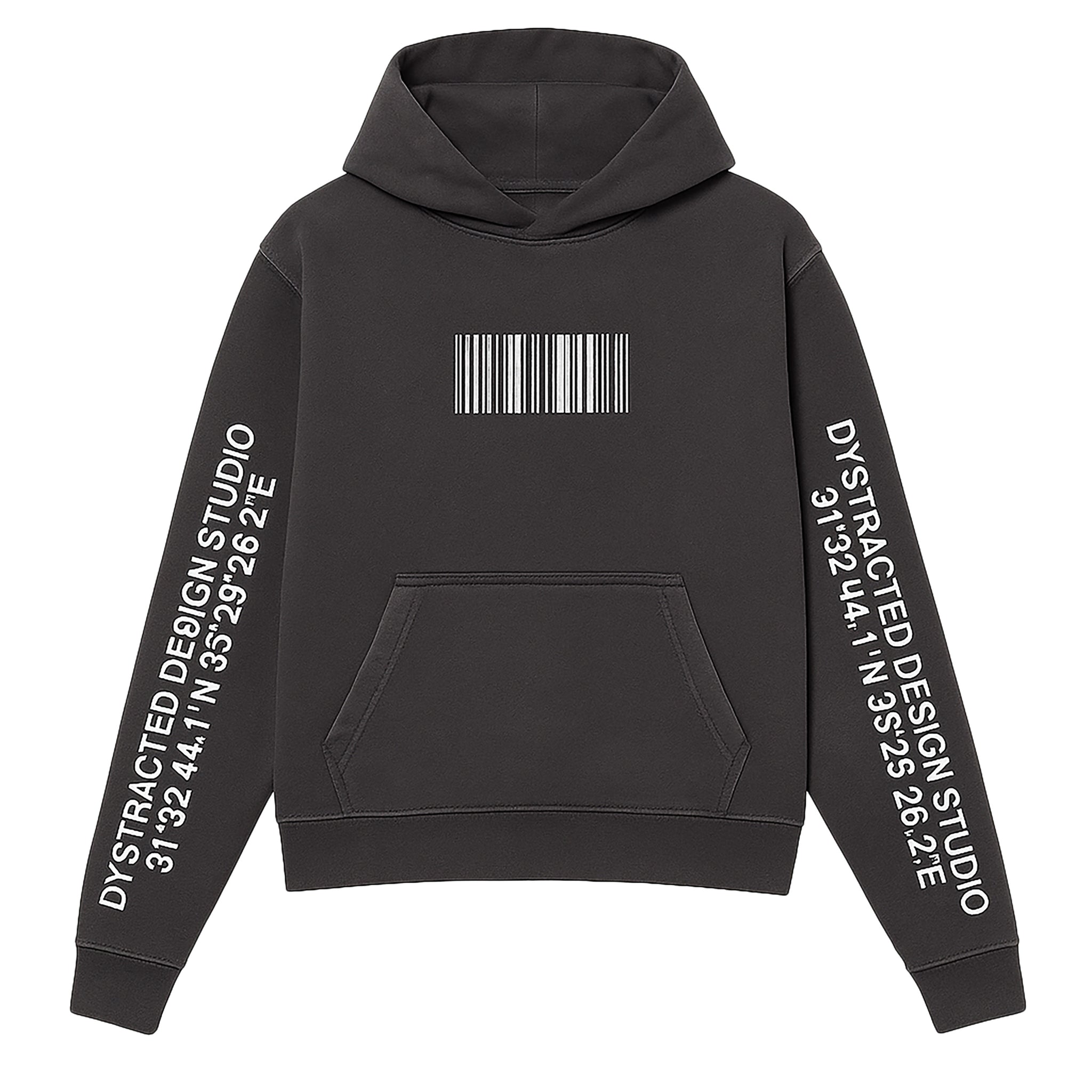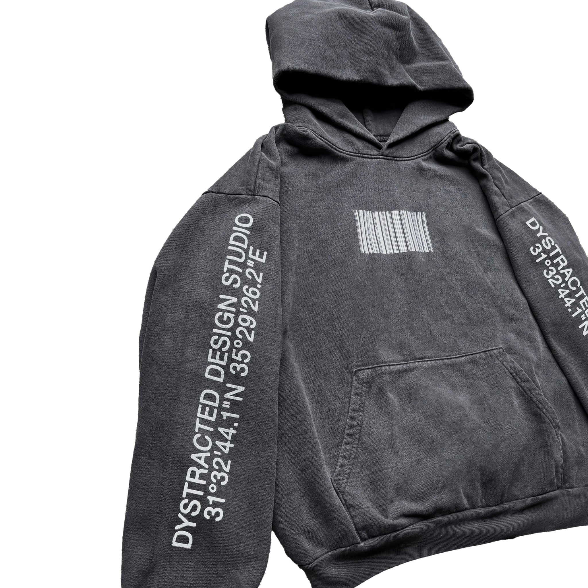 The Studio Hoodie is a staple of the Dystracted family. It features our bar code logo screen-printed across the chest, as well as our coordinate logo printed on both sleeves. Using white ink on a vintage faded black, heavyweight cotton hoodie. The fabric used is dyed and pre-shrunk, so that a wash will not affect the size or feel of the garment. Fits true to size with a slightly boxy silhouette.